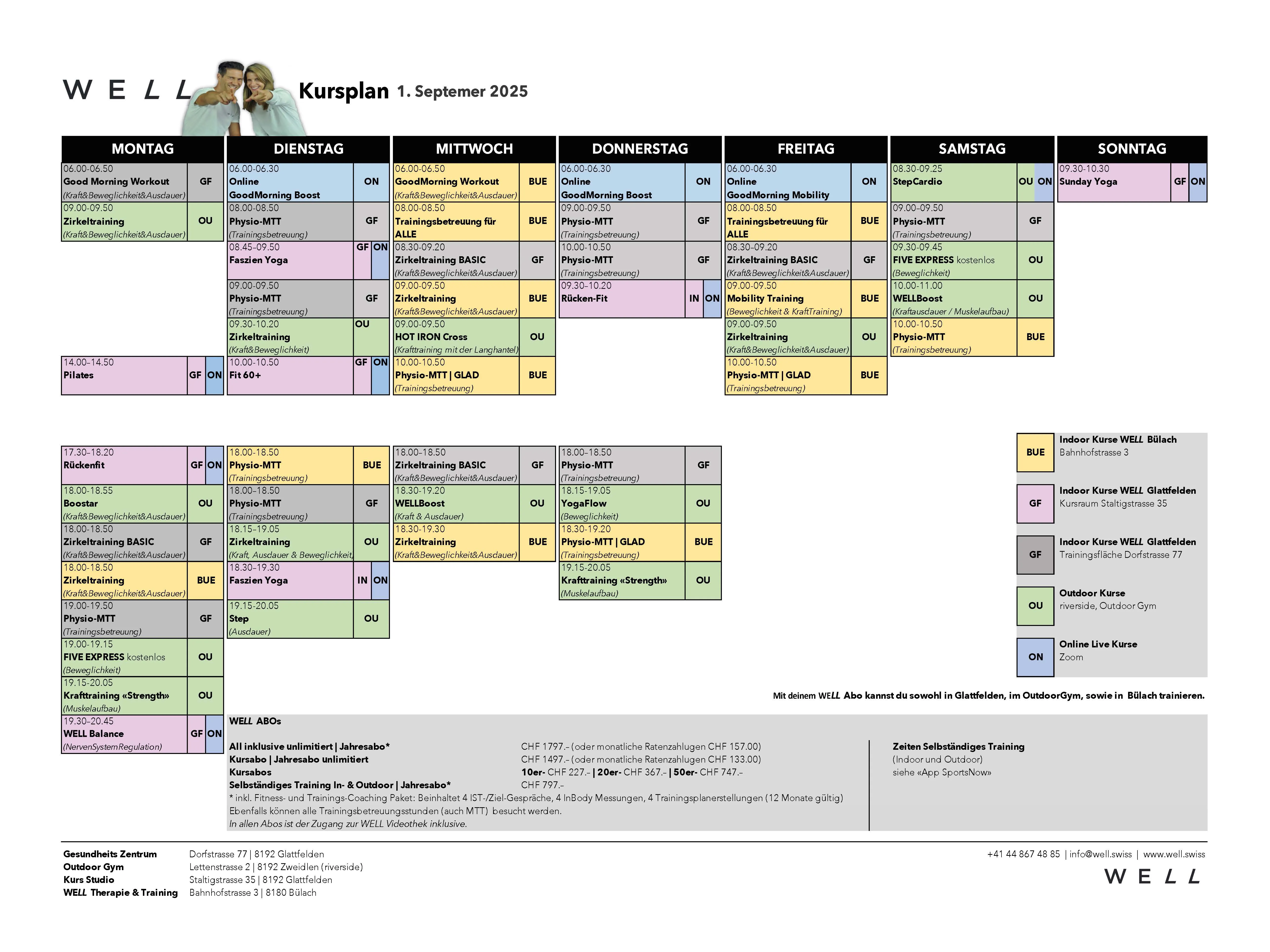 Trainiere an unseren drei Standorten Glattfelden, Outdoor Gym und Bülach und/oder profitiere von unserem Online-angebot. Auf dem Kursplan findest du die aktuellen Zeiten. Während den Festtagen und Schulferien sind die Kurspläne angepasst.